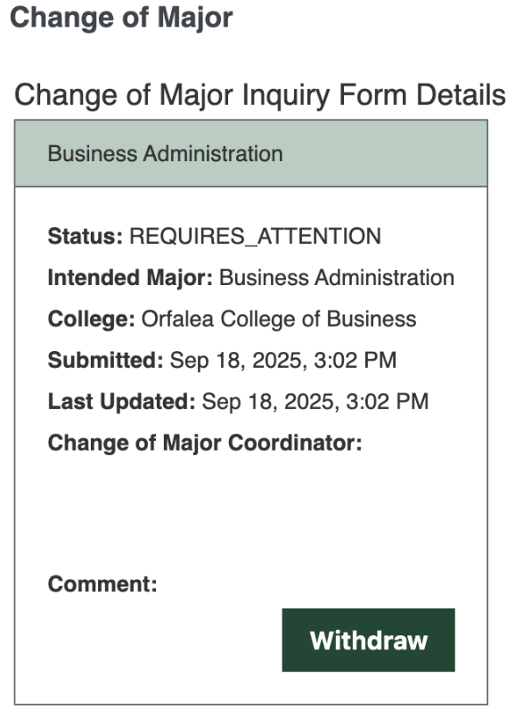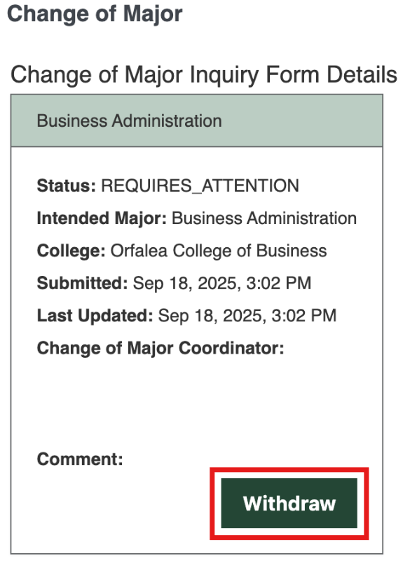 Click the “Withdraw” button under the Change of Major Inquiry Form Details portlet.