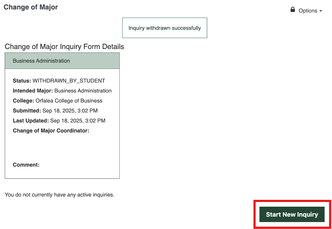 Click the “Start New Inquiry” button under the Change of Major Inquiry Form Details.